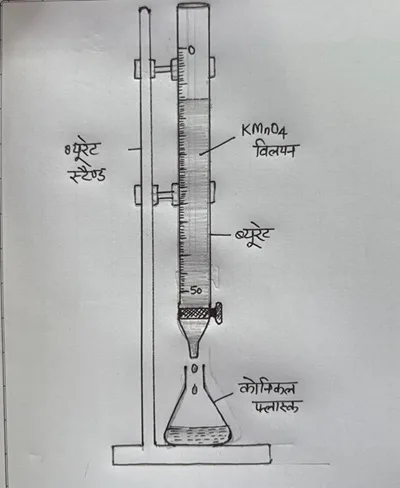 (3) दिए गए KMnO4 विलयन को ब्यूरेट में भरिए तथा ब्यूरेट में भरे इस विलयन के तल का पाठ्यांक नोट कीजिये |